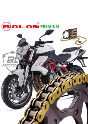 The Benelli TNT 600 Rolon Chain & Sprocket Kit (BRASS) is a high-quality replacement kit for the chain and sprockets on the Benelli TNT 600 motorcycle. The kit is produced by Rolon, a well-known Indian manufacturer of motorcycle chains and sprockets.
